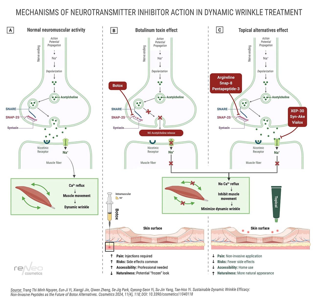 - Trang Thi Minh Nguyen, Eun-Ji Yi, Xiangji Jin, Qiwen Zheng, Se-Jig Park, Gyeong-Seon Yi, Su-Jin Yang, Tae-Hoo Yi. Sustainable Dynamic Wrinkle Efficacy: Non-Invasive Peptides as the Future of Botox Alternatives. Cosmetics 2024, 11(4), 118; DOI: 10.3390/cosmetics11040118