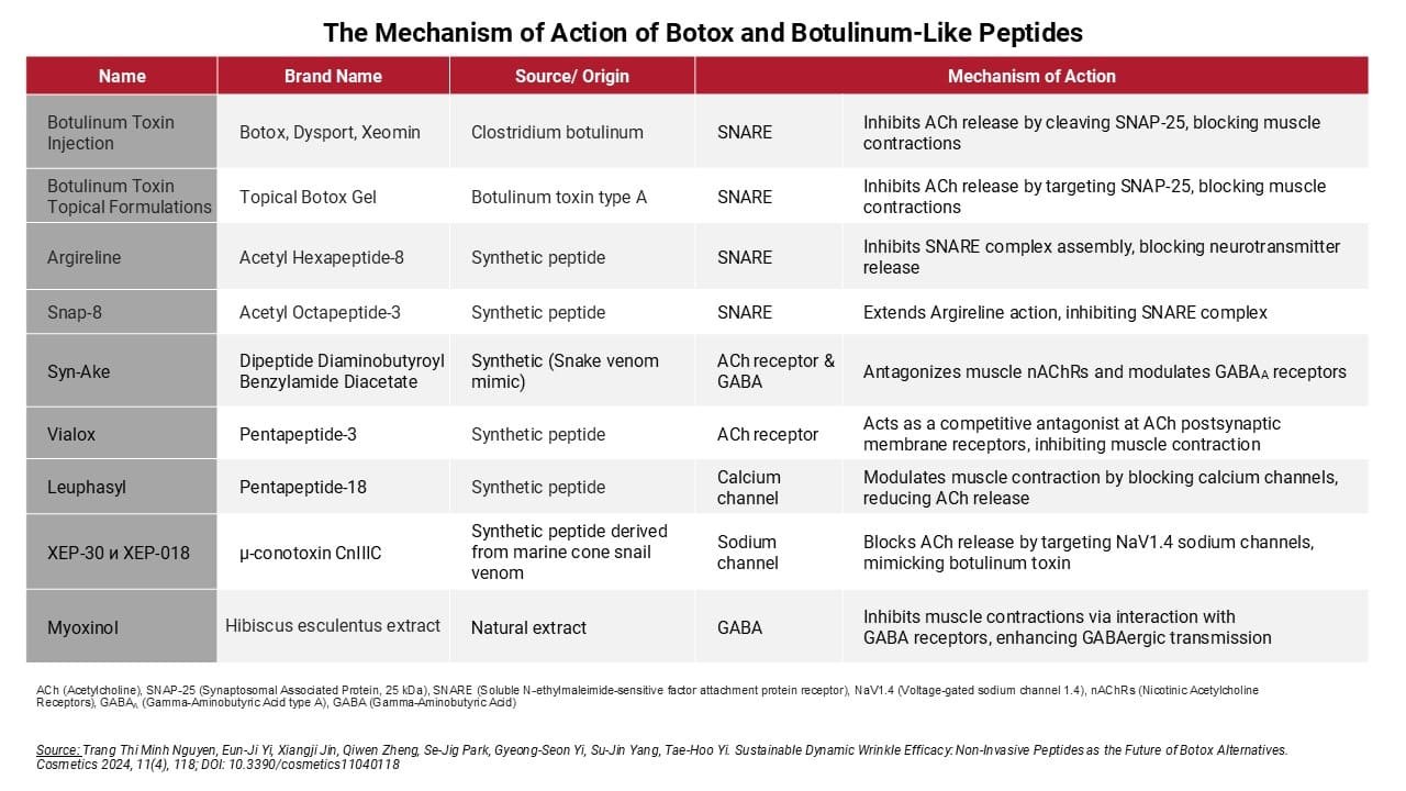Botulinum-like peptides are synthetic equivalents of the active components of botulinum toxin, designed to affect neuromuscular transmission without the need for injections. They are similar to botulinum toxin, but have a number of features that make them safer and more convenient for use in cosmetic products for external use.
