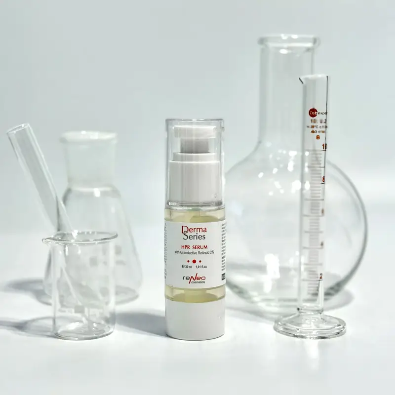 The latest generation retinoid HPR (Hydroxypinacolone Retinoate) is a new ester of retinoic acid. It binds directly to the retinoid receptors of skin cells and takes effect without causing side effects like other retinoids. HPR regulates the transfer of genetic information from DNA to RNA, stimulates the synthesis of collagen, moisturizes glycosaminoglycans, and filaggrin protein, which is responsible for cytoskeleton stability. It also inhibits the activity of matrix metalloproteinases – enzymes that destroy collagen, which are activated by UVB radiation and other pathological factors. HPR thin the upper stratum layer of the epidermis consisting of dead horny scales, which leads to the reduction of wrinkles. By normalizing keratinization processes, it prevents the clumping of horny scales, which can clog pores. It also helps to normalize the production of sebum, which eliminates inflammatory acne-like rashes. Additionally, it whitens the skin and prevents the accumulation of melanin in the layers of the dermis and epidermis.