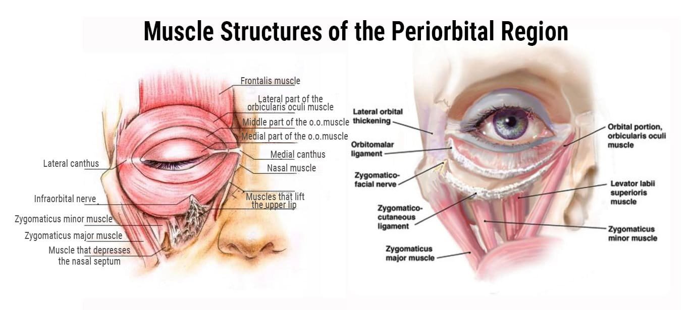 Hovedmuskelen i det periorbitale området er musculus orbicularis oculi, som er ansvarlig for blunking, lukking av øyelokkene, mimikk og uttrykk av følelser. I løpet av den våkne tiden utsettes dette området for høy muskulær belastning, noe som fører til økt mekanisk stress på huden. Den intensive aktiviteten i musculus orbicularis oculi bidrar til dannelsen av mimiske rynker («kråketær») og dype statiske endringer med alderen. Med alderen kan hypertonus i denne muskelen føre til at øyet synker innover, øyespalten blir mindre og mer avrundet, og huden på øvre øyelokk begynner å henge og folde seg. Huden på nedre øyelokk blir rynkete (dersom den ligger tett mot muskelen), eller den henger i poser ved hyppige hevelser eller vedvarende væskeopphopning mellom hud og muskel på grunn av dårlig lymfedrenasje.