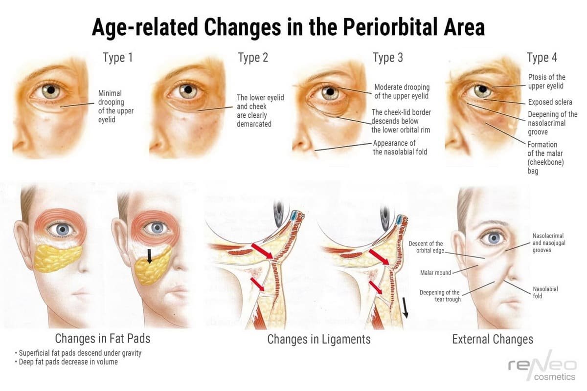 - Reduksjon i fettvolum og omstrukturering av de dype strukturene i det periorbitale området ved aldring.