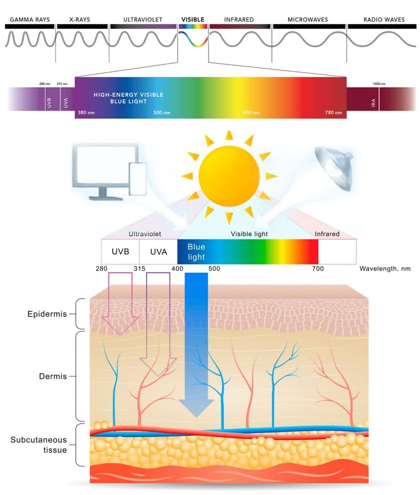 Synlig lys trenger dypere inn i huden enn ultraviolet stråling, men det virker mer overfladisk enn UV-stråling. Hemoglobin og melanin i epidermis absorberer synlig lys veldig effektivt. Blått lys har en høy-energi bølgelengde i området fra 380 til 500 nm, så det kan lettere trenge inn i de dypere lagene av huden – til en dybde på 0,07-1 mm.