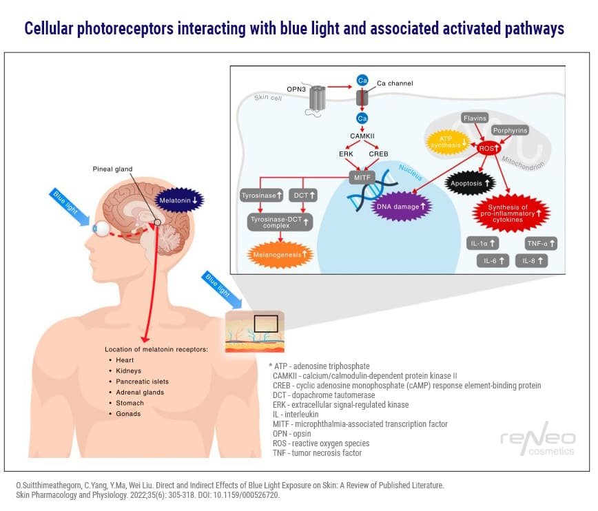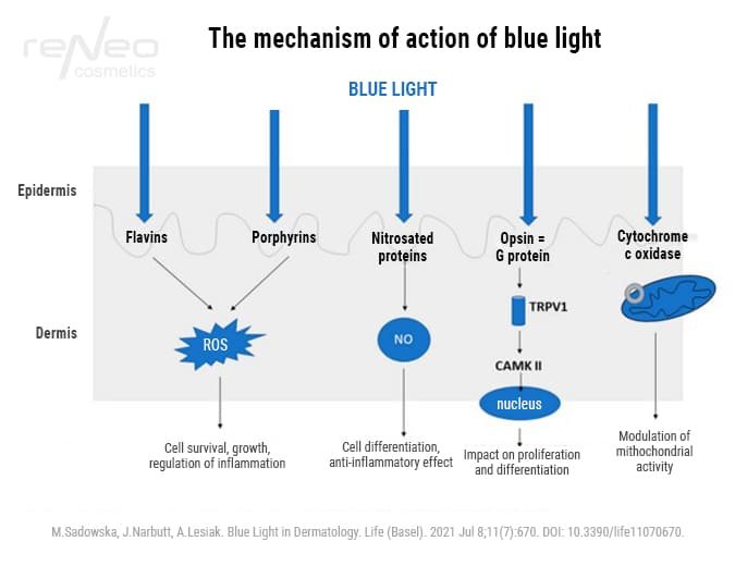 Blått lys har en direkte effekt på huden, ved å samhandle med kromoforer: flaviner, porfyriner, opsiner, nitroserte proteiner (for eksempel S-nitroalbumin). Aktivering av disse molekylene fører til overproduksjon av reaktive oksygenarter (ROS), frigjøring av reaktive nitrogenarter (nitrogenoksid (NO)), og hyperpigmentering.