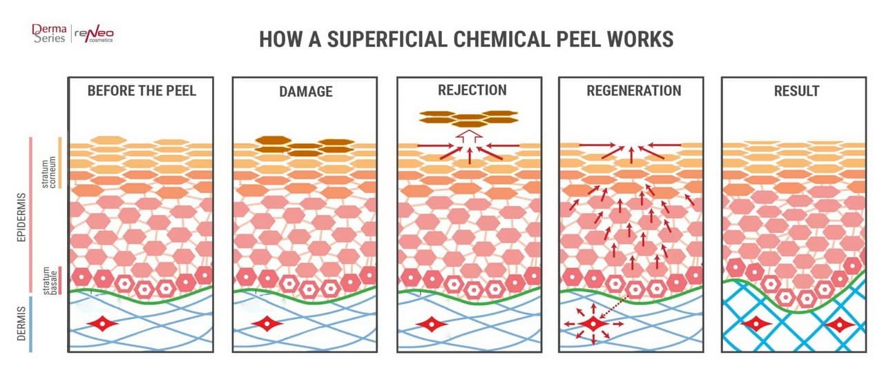 Hovedmålet med peeling er å påføre kontrollert skade på hudens øverste lag for å stimulere fornyelse. Overfladiske kjemiske peelinger virker innenfor epidermis. Syren på hudens overflate forårsaker en ikke-spesifikk betennelse, som fører til syntese av chaperonproteiner. Deling av cellene i det basale laget stimuleres, regenereringsprosessen og cellenes metabolske aktivitet økes. Syntesen i lamellgranulene øker, cytokiner, nevropeptider og prostaglandiner frigjøres.