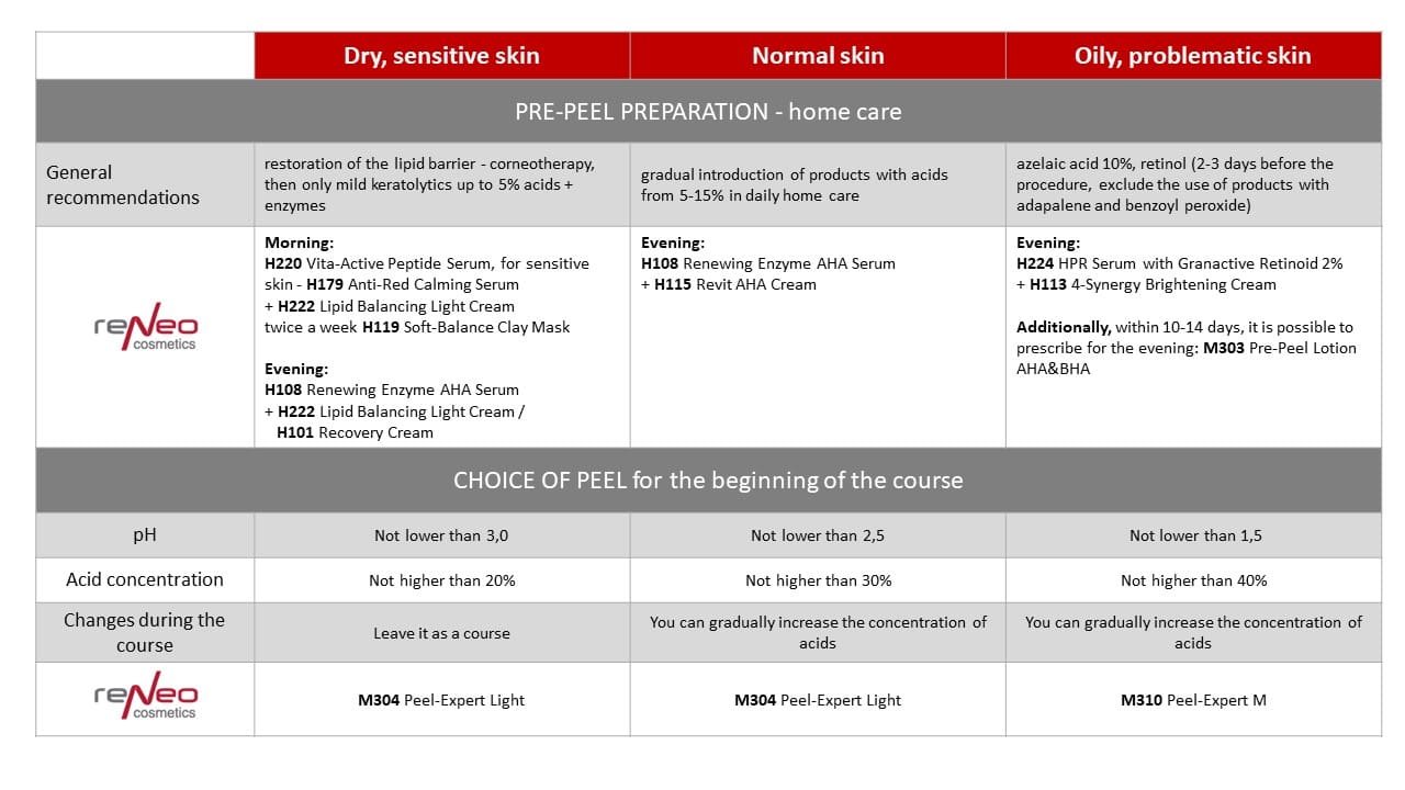 - fet, problematisk hud – azelainsyre 10%, retinol (2-3 dager før prosedyren, unngå produkter med adapalen og benzoylperoksid); startpeel med pH ikke lavere enn 1,5, syrekonsentrasjon ikke høyere enn 40%, og du kan gradvis øke syrekonsentrasjonen.