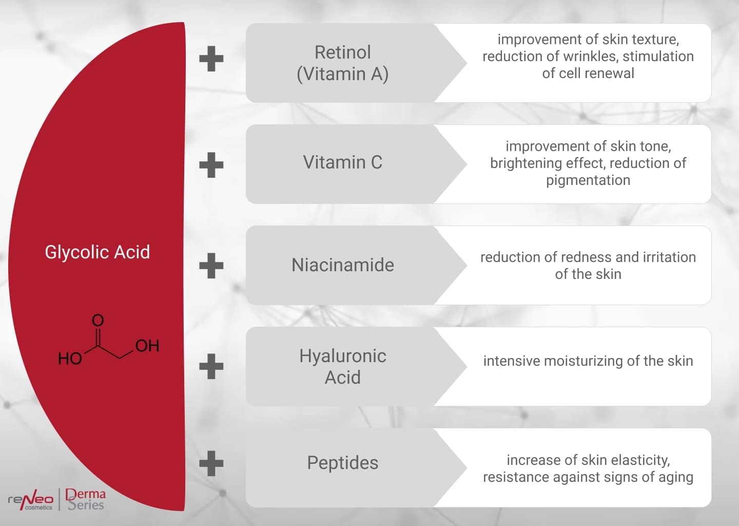 • Antioksidant – og betennelsesdempende effekt – reduserer produksjonen av inflammatoriske mediatorer. Rensende av porene, hindrer dannelse av komedoner, svarte prikker og betennelseselementer. Glykolsyre eliminerer hyperkeratose og normaliserer talgproduksjon gjennom sin indirekte effekt på differensieringen av keratinocytter, noe som gjør at den kan brukes i aknebehandlingsprotokoller.
