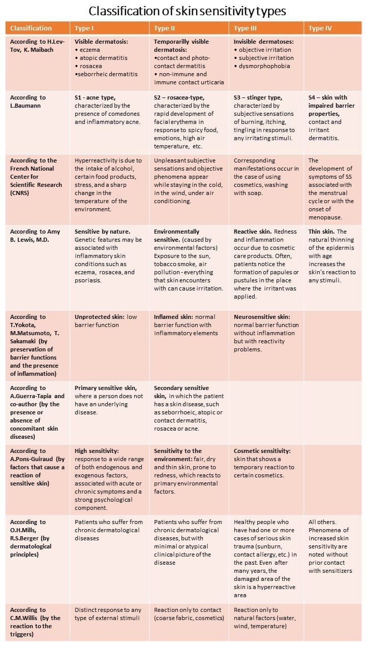 Mangfoldet av klassifikasjoner av sensitiv hudtype reflekterer også mangel på enighet blant dermatologer om dette temaet: