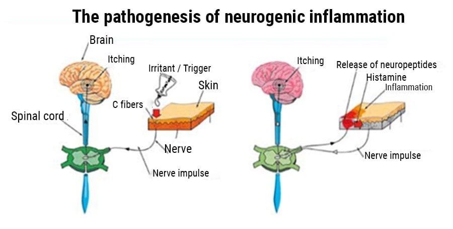 Histamin utvider blodårene umiddelbart, øker rødhet i huden, og kløe og svie kan oppstå. Deretter kommer symptomer på skade på hudens barriere, som tørrhet og flassing.